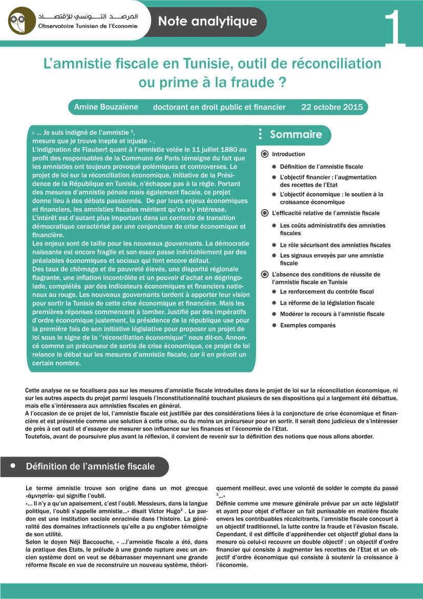 L’amnistie fiscale en Tunisie, outil de réconciliation ou prime à la fraude? Amine Bouzaïene, OTEoctobre 2015